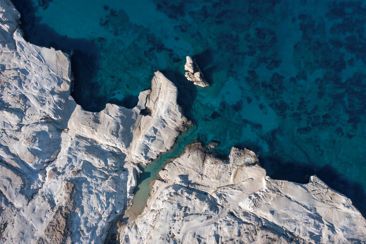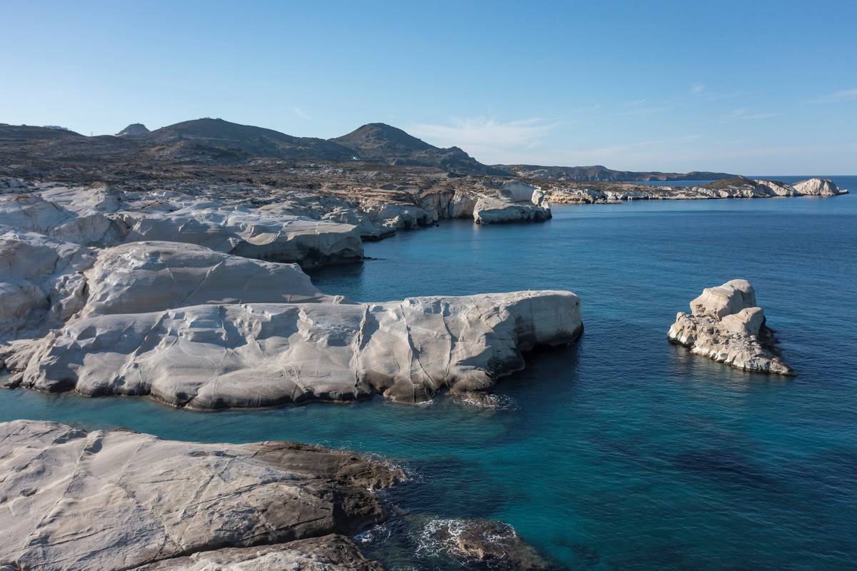 Stejně jako Santorini je Milos sopečný ostrov, na kterém se nachází jedna z nejunikátnějších pláží Řecka, Sarakiniko (na snímku). Díky svým spektakulárním bílým útvarům, které zaoblily vlivy eroze, takzvaná „měsíční pláž“ každé léto přiláká davy lidí. Koupající se natěsnají mezi jednotlivé útvary.